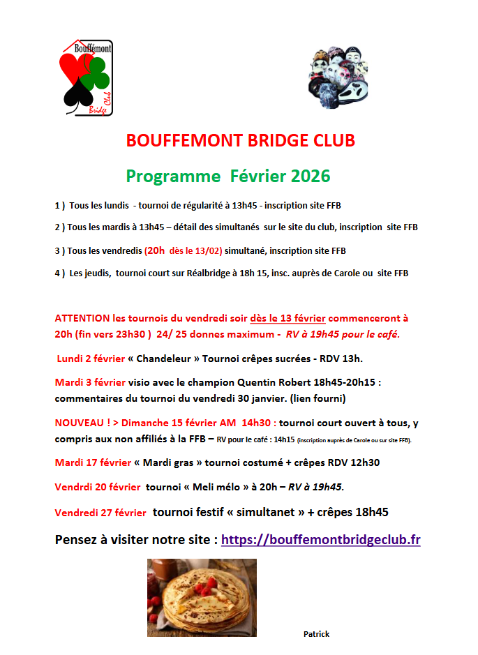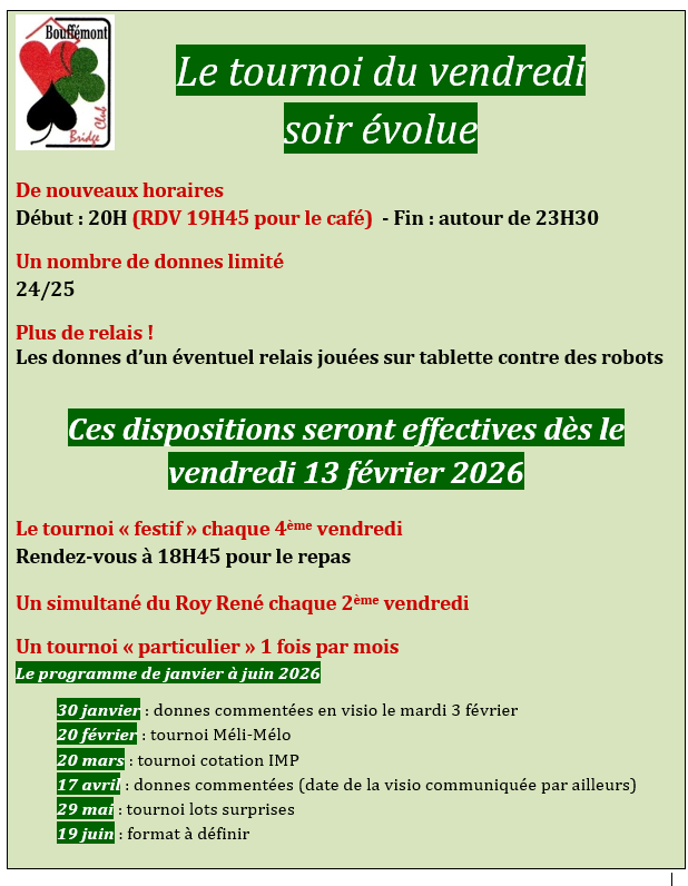 Le programme du mois de Février est arrivé : attention modification du format du vendredi soir