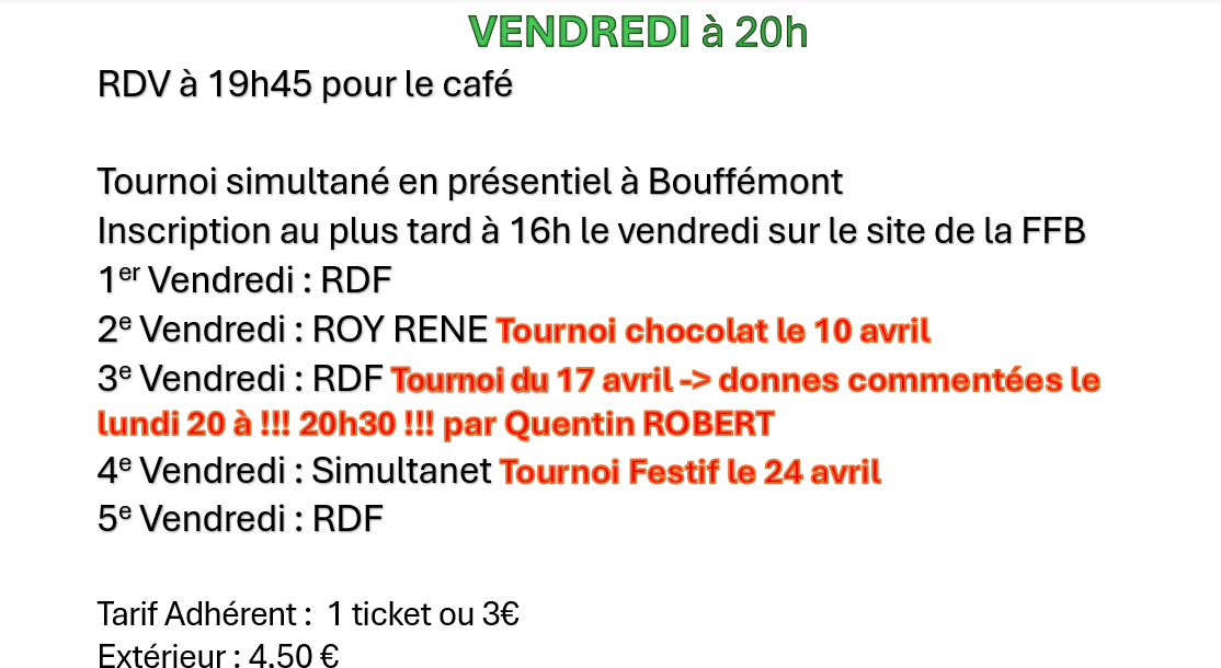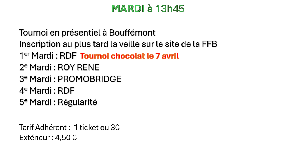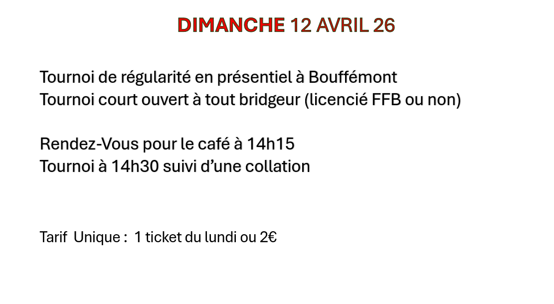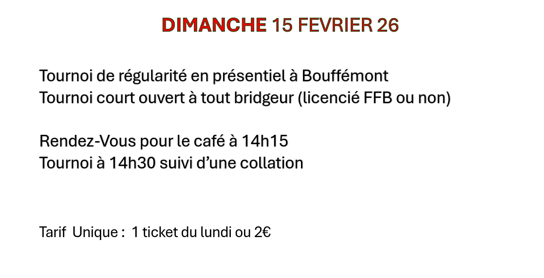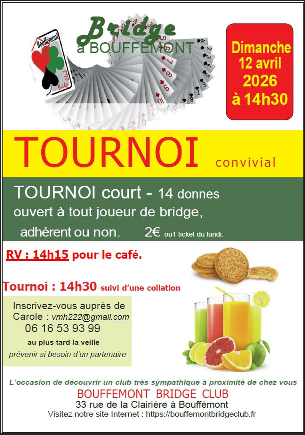 - "inscriptions tournois clubs" - Bouffémont Bridge club - (ne vous trompez pas de tournoi) et cliquer sur : " recherche un partenaire"