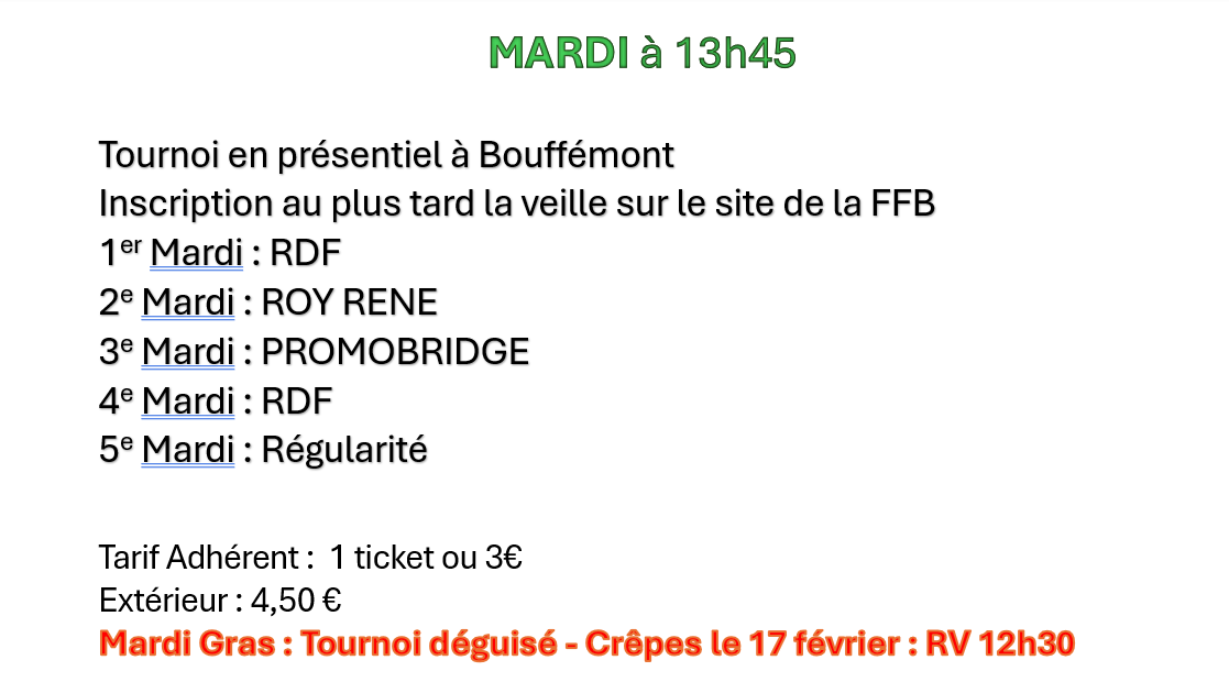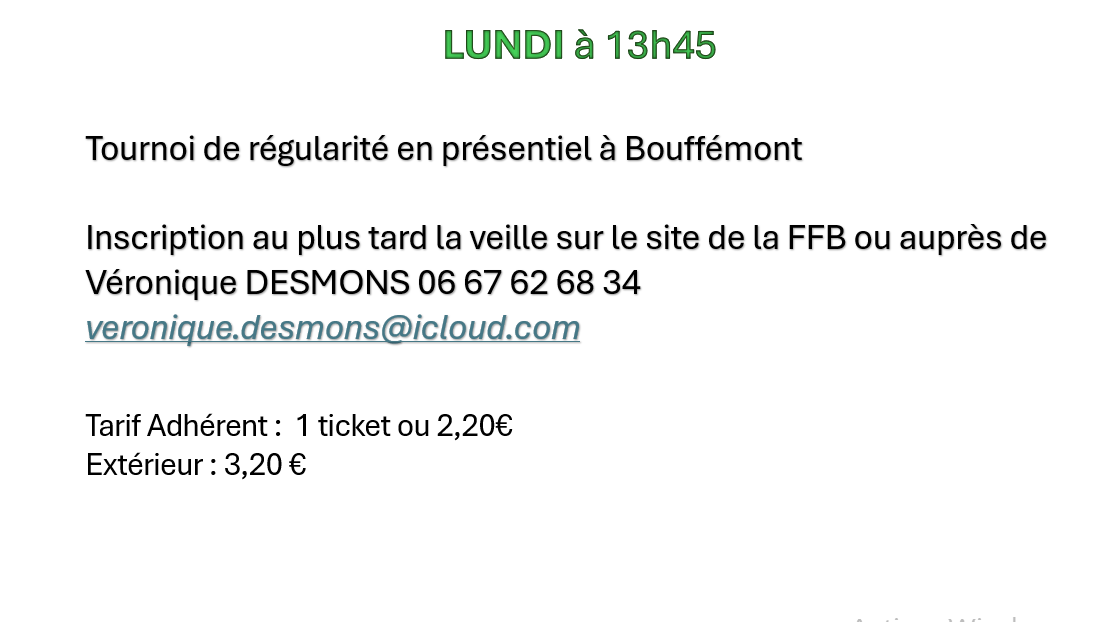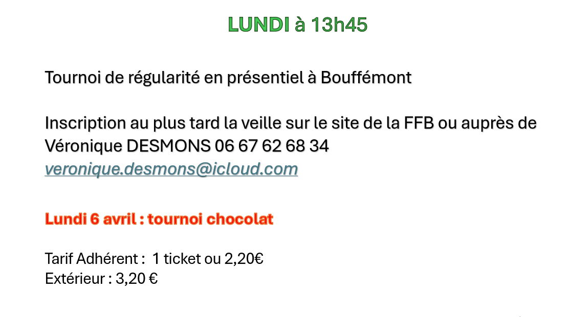 > Patricia DAUNY-DAUMAS : pat.dauny@orange.fr - pour les tournois des lundis AM mardis AM