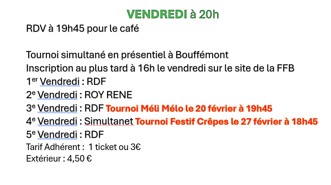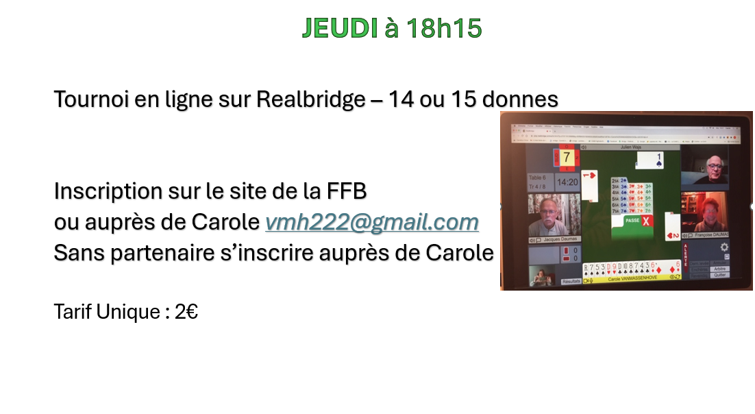 > Carole VANMASSENHOVE : vmh222@gmail.com pour le vendredi soir et pour le tournoi en ligne du jeudi